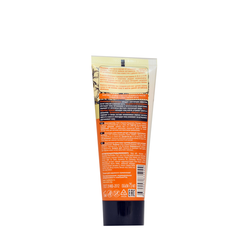 Thành phần: Aqua with infusions of Hippophae Rhamnoides Fruit Juice (nước ép quả Hắc mai biển vùng Altai); Cetearyl Alcohol, Isopropyl Palmitate, Stearic Acid, Palmitic Acid, Helianthus Annuus Seed Oil, Elaeis Guineensis Oil, Pulmonaria Officinalis Extract (chiết xuất dầu Cỏ phế Altai), Ribes Nigrum Seed Oil (tinh dầu hữu cơ hạt phúc bồn tử Siberia), Tocopheryl Acetate (vitamin Е), Sodium Cetearyl Sulfate, Xanthan Gum, Benzyl Alcohol, Benzoic Acid, Sorbic Acid, Citric Acid, Parfum.
